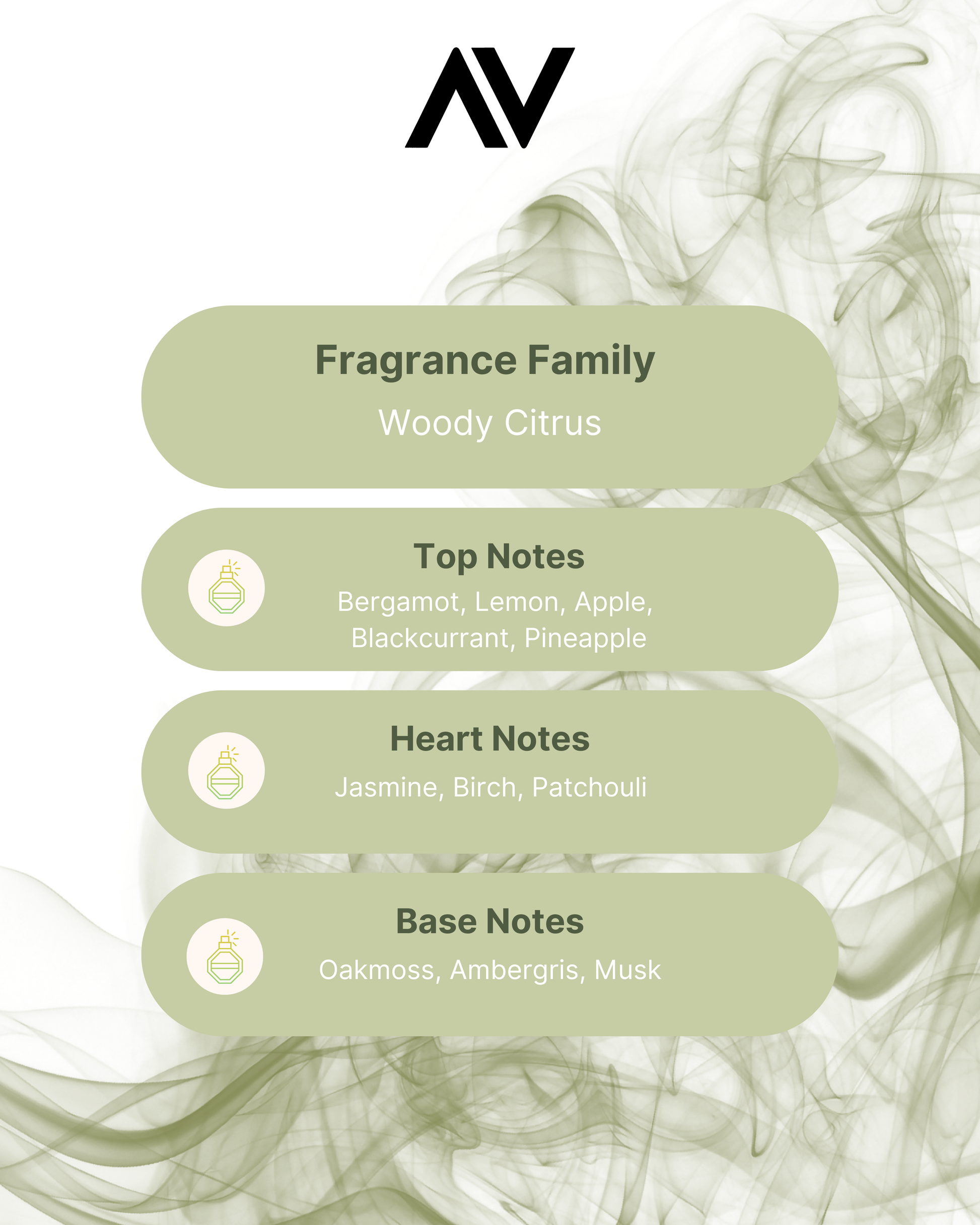 The composition opens with a vibrant burst of citrus, bergamot and lemon, blended with crisp apple, blackcurrant, and pineapple, evoking the freshness of new beginnings. At its heart, smoky birch and elegant jasmine add depth and character, revealing strength beneath refinement. Finally, oakmoss, ambergris, and musk anchor the fragrance in warmth and enduring luxury, a signature that lingers with quiet power.
