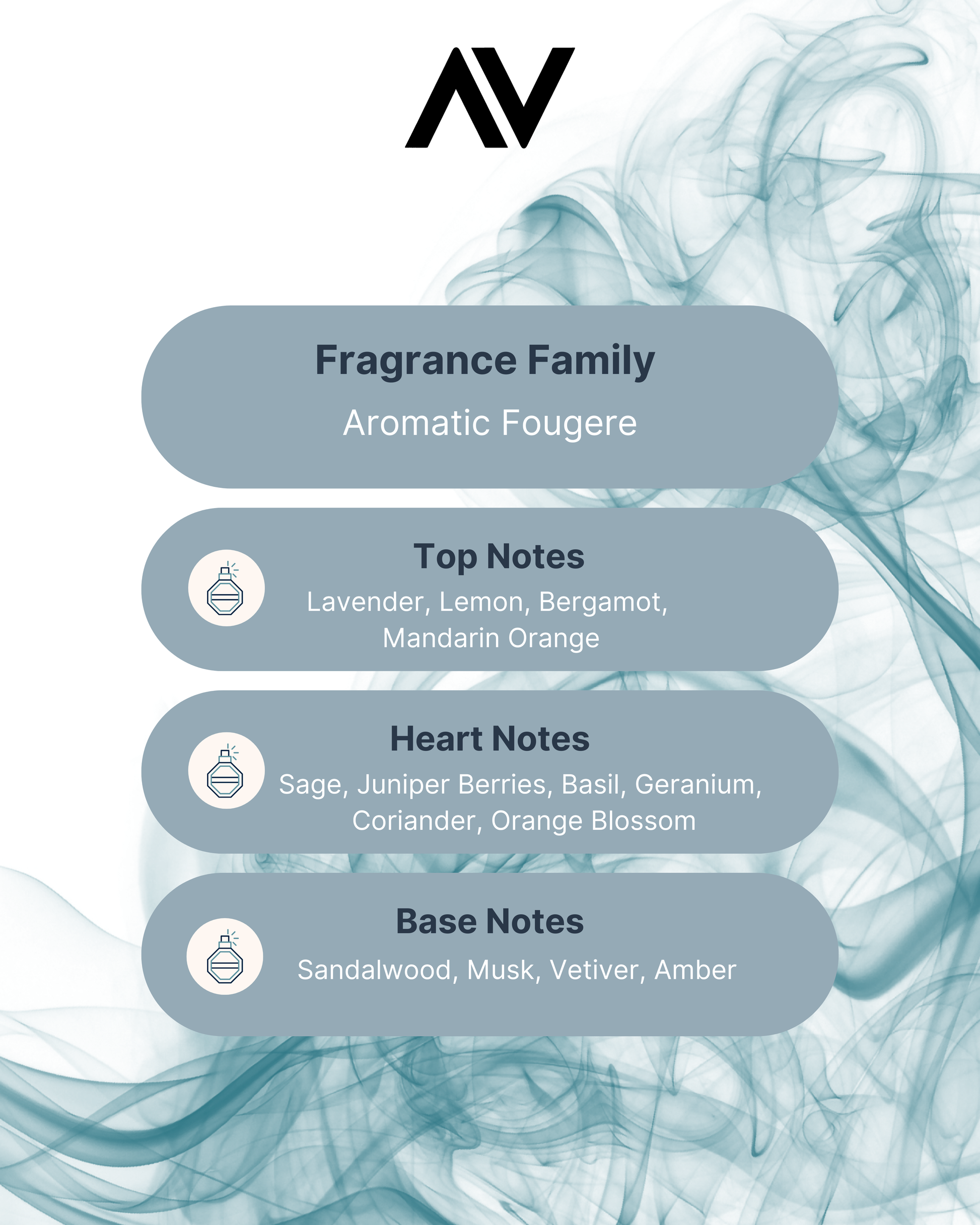 Heart Notes: Sage, Juniper Berries, Basil, Geranium, Coriander, Orange Blossom, Lily-of-the-Valley